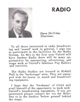 In the fall of 1963 student David Shilliday with the help of physics Professor Ron Riddell started the United College Radio System. Students could share music over the PA between classes and would sometimes tap into the CBC to share breaking news like the Kennedy assassination later that year.