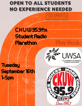 UW students can sign up for a no-experience-necessary chance to create a half hour show/podcast live on CKUW! Go to the sign up page and claim your time now. Sign Up For Student Radio Marathon