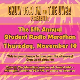 On Thursday, November 10 CKUW 95.9 FM hosted, along with the University of Winnipeg Students’ Association (UWSA), the 5th Annual Student Radio Marathon on Thursday, November 10. Below is the schedule and links to the programming. Enjoy!